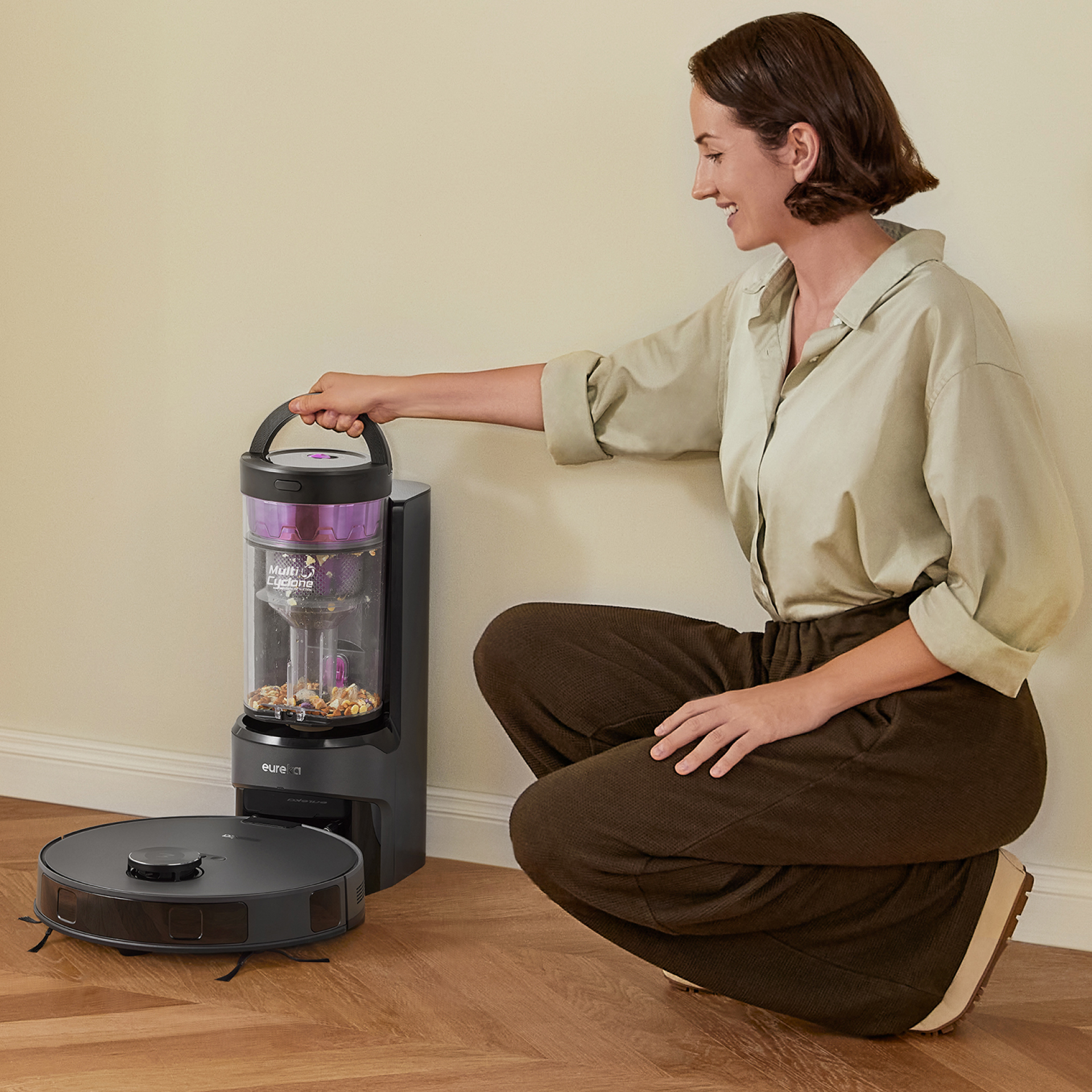 An innovative pull-up handle on the top of the base station simplifies the process of lifting the unit, making debris disposal efficient and effortless.