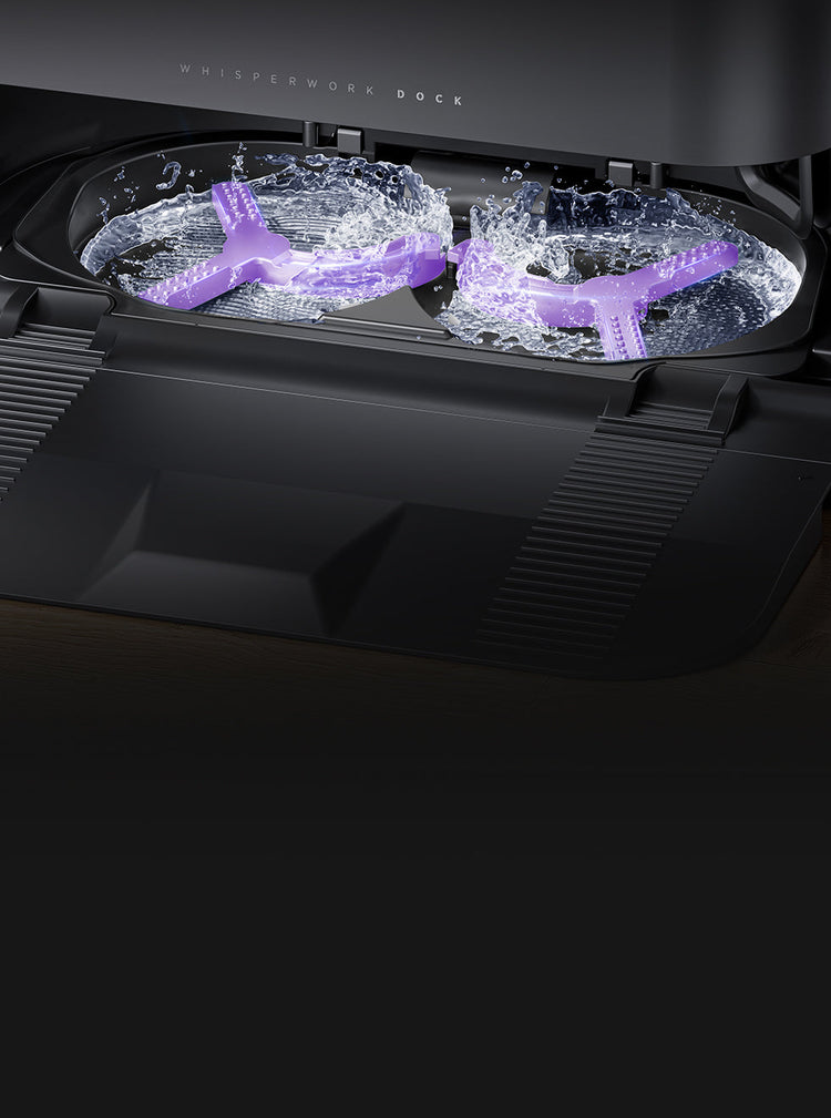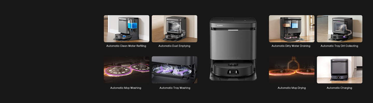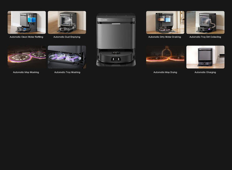 The base station automatically refills clean water, drains dirty water, collects dust, washes the mop, dries the mop, cleans the tray, and charges automatically to make cleaning totally hands-free.