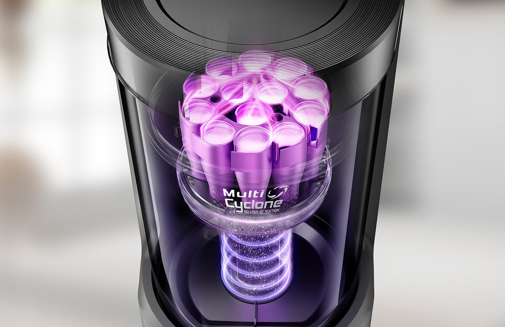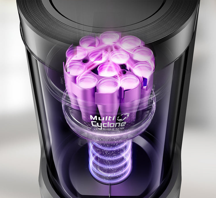 Incorporating a 13-cone structure, multi-cyclonic separation technology combines with powerful centrifugal force, generated by the suction during dust collection, to separate 98%* of dust and dirt before they reach the filter. This significantly extends the filter's lifespan and helps maintain the base station's suction power, preventing the dust